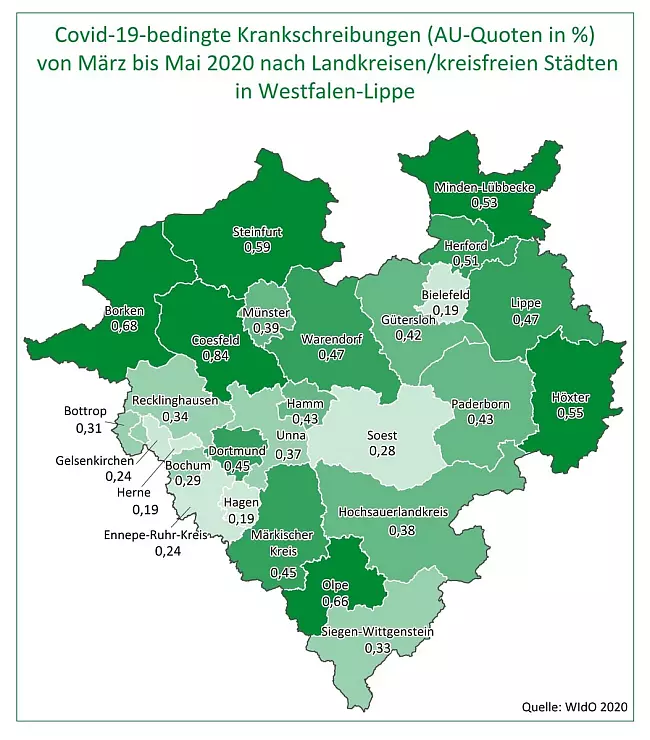 Regionale Unterschiede spiegeln sich auch im Arbeitsunfähigkeitsgeschehen wider (siehe Grafik). Die höchste AU-Quote lag im Kreis Coesfeld (0,84 Prozent). In OWL belegen die Kreise Höxter (0,55) und Minden-Lübbecke (0,53) die vorderen Plätze - dicht gefolgt von Herford (0,51). Die Kreise Lippe (0,47), Paderborn (0,43) und Gütersloh (0,42) liegen im Mittelfeld. Am geringsten waren die Corona-bedingten AU-Quoten in Hagen, Herne und Bielefeld (je 0,19 Prozent).