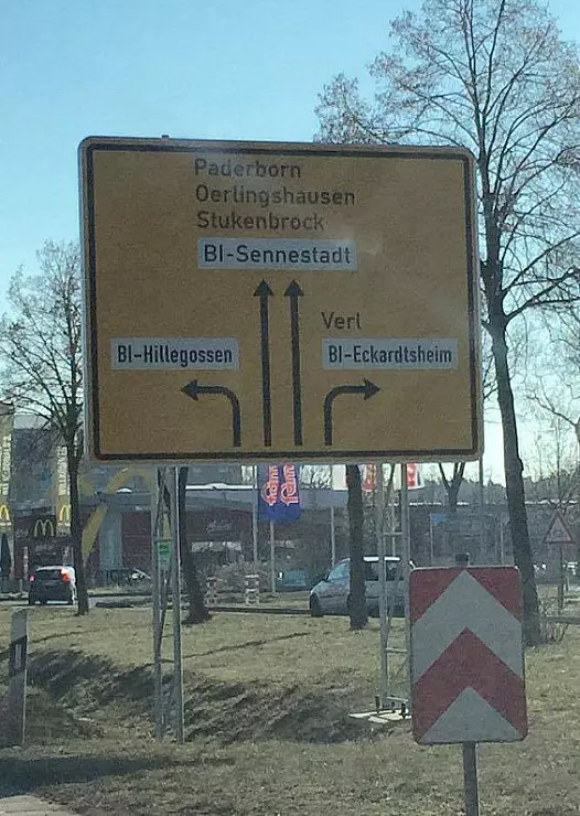 Einen weitaus unterhaltsameren Fehler entdeckten aufmerksame Autofahrer nach der Eröffnung des neuen Autobahnteilstücks im Bielefelder Süden: Hier tauchten seinerzeit mehrere neue Hinweisschilder an den Straßen auf. Bei drei Schildern rieben sich die Verkehrsteilnehmer die Augen.