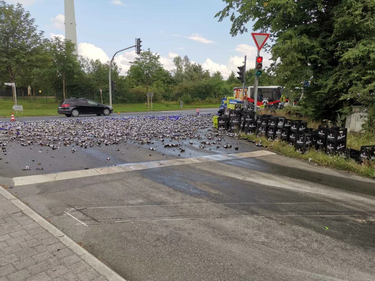 „Durch die Feuerwehr wurden die größtenteils beschädigten Bierflaschen beseitigt", so Voßmann weiter. Auch ein Spediteur und eine Kehrmaschine seien zur Beseitigung herangezogen worden.