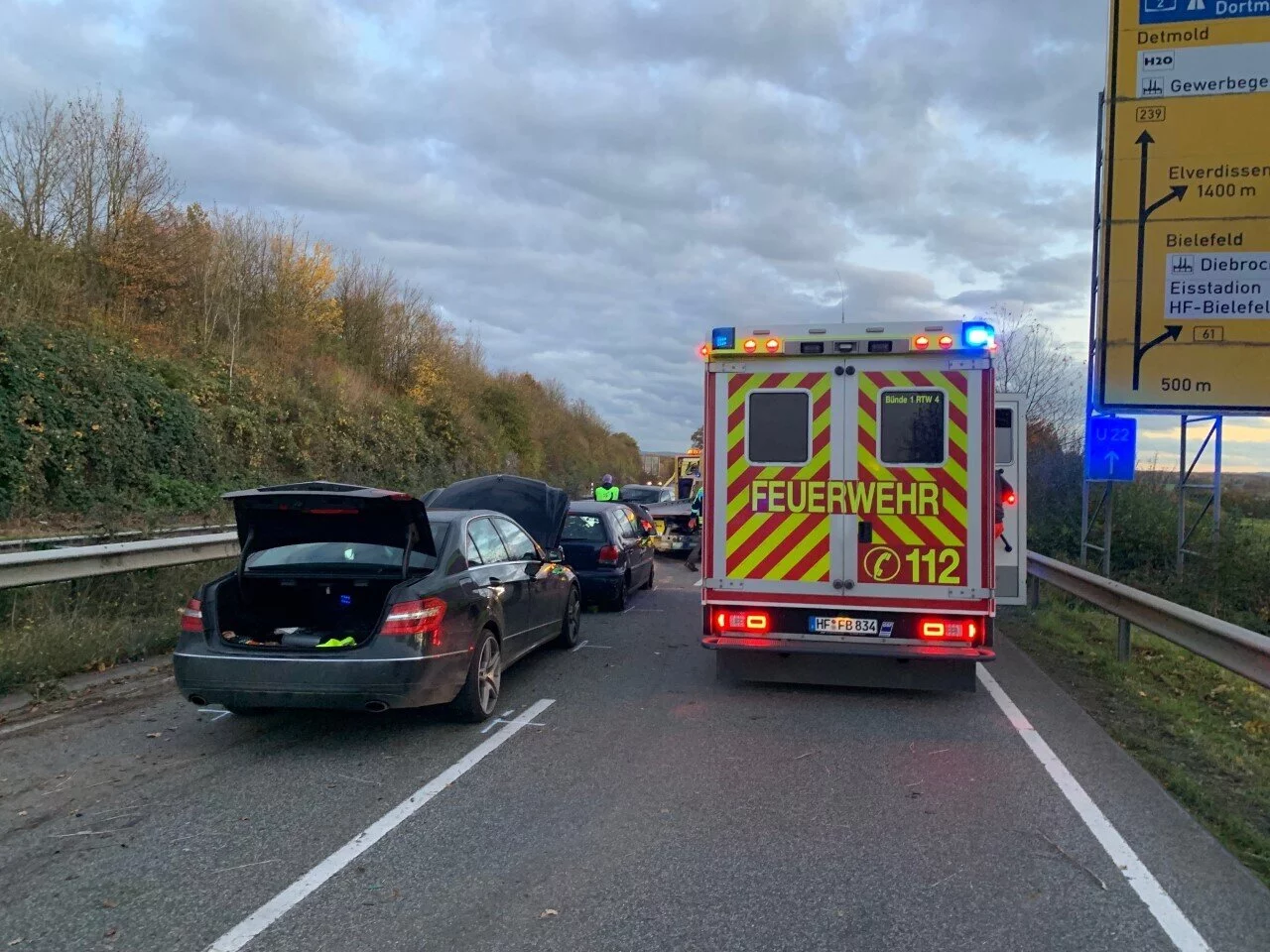 Der Audi und der VW Polo kollidierten, kamen ins Schleudern und rammten wiederholte Male die Mittelschutzplanke. Ein nachfolgender Mercedes, ebenfalls aus dem Kreis Höxter, erkannte die Situation nicht früh genug und prallte in das Heck des VW Polo.