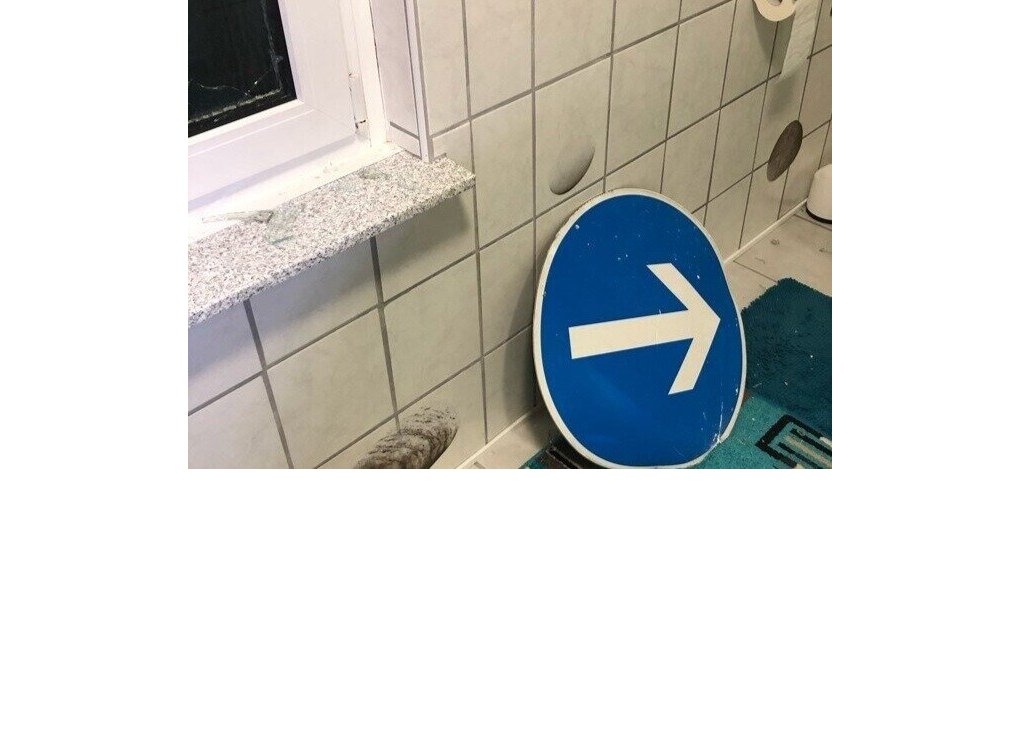 Verkehrszeichen durchschlägt Badezimmerfenster