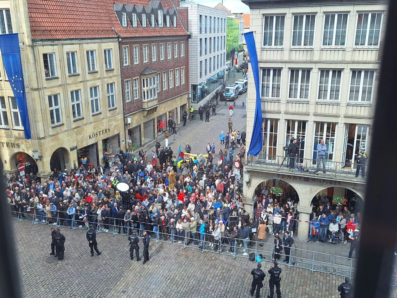 Die Gäste warteten schon ab dem Morgen auf den Auftritt von Macron, der sich verspätet hatte – und schließlich um 11 Uhr im schwarzen Renault vorgefahren kam. Macron wurde zunächst von Steinmeier zur Begrüßung herzlich umarmt. Die Zuschauer hinter den Absperrgittern jubelten ihnen zu. Pfiffe gegen Politiker – das schien es in Münster nicht zu geben.