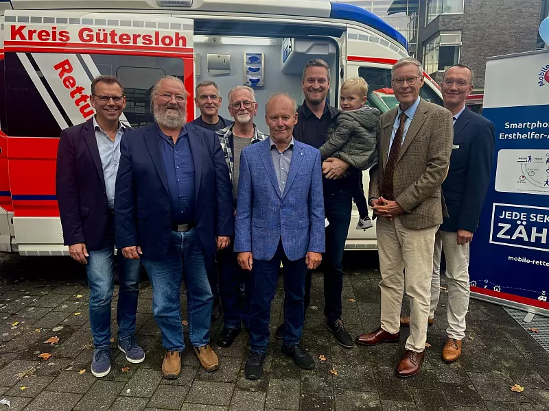 Schulte und van Diesen sind Teil der „Mobilen Retter“, einem im Kreis Gütersloh entwickelten Lebensrettungssystem. Die Smartphone-basierte Alarmierungssoftware unterstützt seit mehr als zehn Jahren die Rettungskette im Kreis Gütersloh. In über 6.000 Einsätzen hat das Ersthelfernetzwerk bereits geholfen, Leben zu retten. 150 „Mobilen Rettern“ wurde nun mit einer Dankesfeier im Kreishaus für ihren Einsatz gedankt. Auch einige Gerettete und ihre Angehörigen waren dabei - darunter auch Alexander Bloch und seine Familie.