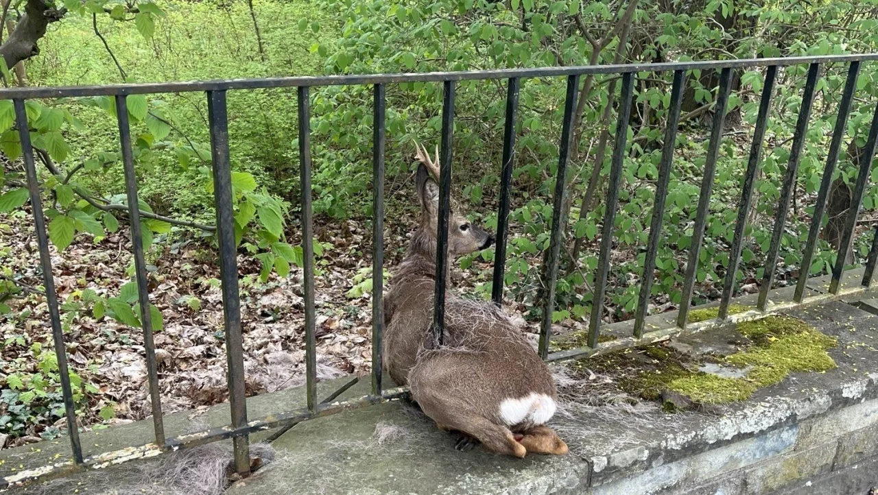 Für den Kopf und das Geweih des Tieres ließen die Stäbe genug Platz, für das Hinterteil nicht. Ein Zeuge fand den Rehbock am Mittwochmorgen in seiner ausweglosen Lage und alarmierte die Polizei.