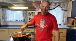 Am dritten Tag der "OWL-Woche" sind die Kandidaten bei Steffi (M.) aus Herford zu Gast. Sie serviert Morris (v. l.) aus Bünde, Marc aus Steinhagen, István aus Spenge und Betty aus Herford unter anderem russische Teigtaschen.