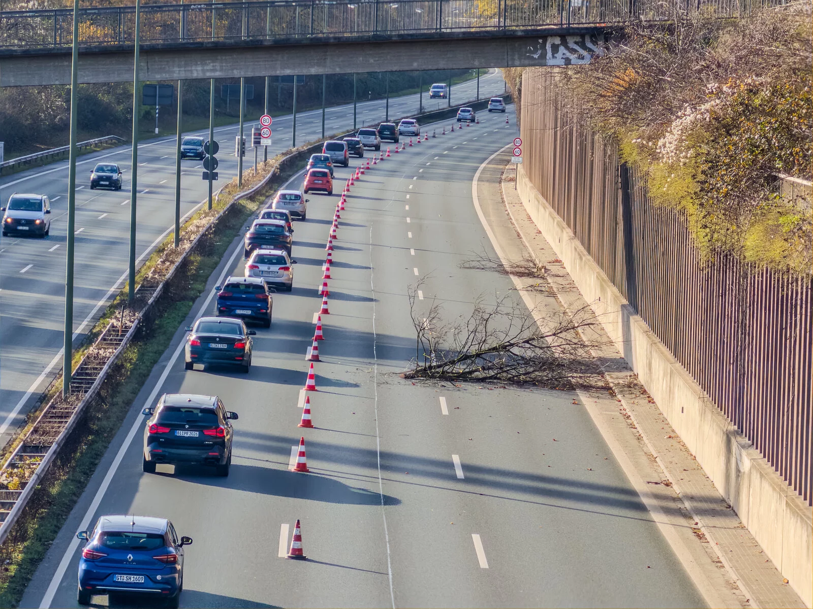 Auf dem OWD steht darum zum Nachmittag nur eine Spur zur Verfügung. Ab Haller Weg sind Markierungen aufgestellt. Der Rückstau bildet sich bis etwa zur Auffahrt Stapenhorststraße. Auf den gesperrten rechten Fahrstreifen liegen immer wieder abgeschnittene Äste und anderes Grünzeug.