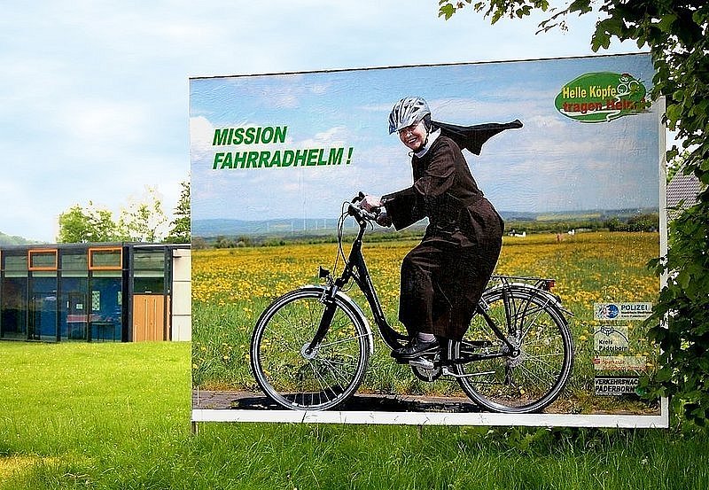 Entsprechend aktiv werben Polizeibehörden für den Kopfschutz. Für die Kampagne "Helle Köpfe tragen Helm" hat sich der Kreis Paderborn nun zwar keinen himmlischen, aber doch immerhin geistlichen Beistand gesichert: Ordensschwester Getrud Terhorst radelt gut behütet durchs Paderborner Land.