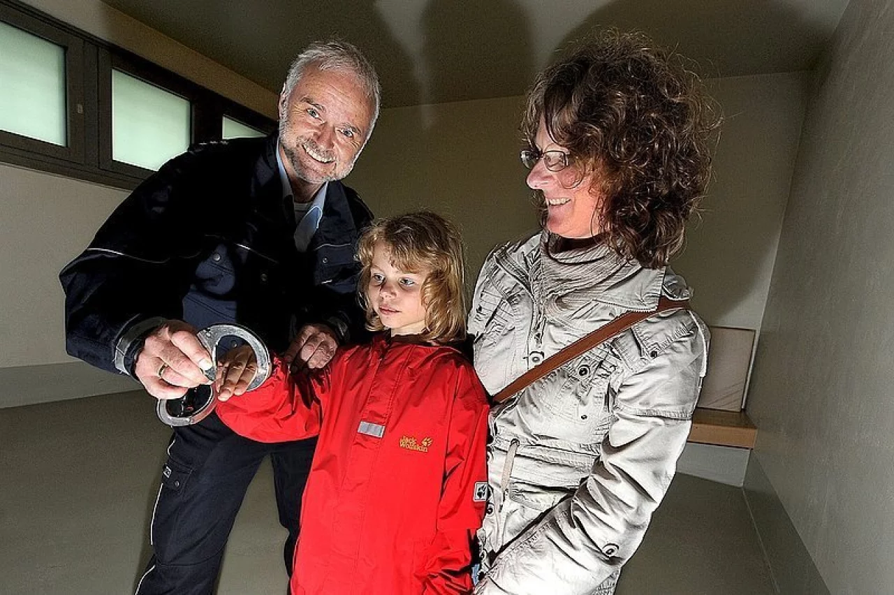 Tino Burgdorf (5) aus Jöllenbeck blieb mit seinen Eltern beinahe den ganzen Tag bei der Polizei: Gleich zu Beginn staunten sie über die mächtigen Polizeipferde, die trotz heftiger Pyroschwaden auf der Aktionsfläche ganz ruhig blieben. Den Bankräuber hätte er auch so umgerannt wie die Actionhelden vom SEK, sagt er mutig, doch beim Besuch einer der 17 Zellen zeigt er Respekt: "Ganz schön leer hier", sagt Tino auf der schmalen Pritsche, neben ihm ist nur noch ein Klo und die zum Glück geöffnete Stahltür.