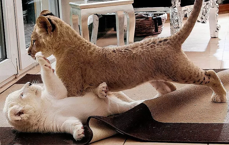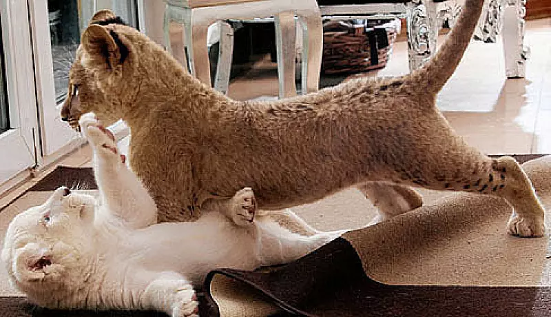 Lejon kennt keine Gnade. Mit weit aufgerissenem Maul macht er sich über Sanya her. Man kann einen Schreck bekommen. Doch der scheinbare Biss in die Kehle des am 6. Juni geborenen braunen Junglöwen ist nur Spielerei. Sanya ist um eine Antwort nicht verlegen, kneift mit seinen schon beträchtlich scharfen Zähnchen zurück und hält sich mit den Pfoten in Lejons Fell fest.