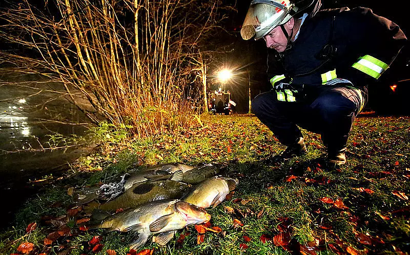 Mit großen tragbaren Pumpen ziehen die Retter nun das sauerstoffarme Wasser aus dem Teich, um es anschließend mit Wasserwerfern und Löschschläuchen zurück in den Teich zu spritzen. Noch bis 21 Uhr werden die Feuerwehrelute das Wasser auf diese Weise umwälzen.