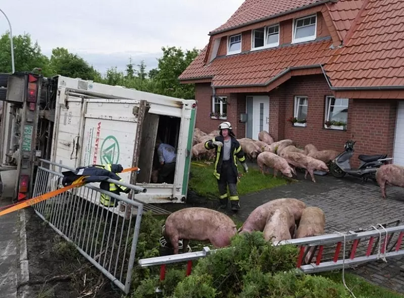 Landwirte und Einsatzkräfte der Borchener Feuerwehr befreiten die Tiere aus dem umgestürzten Gelass. Vor dem Umladen in ein Ersatzfahrzeug durchwühlten die gestressten Borstenviecher den Vorgarten der Familie Nagel.