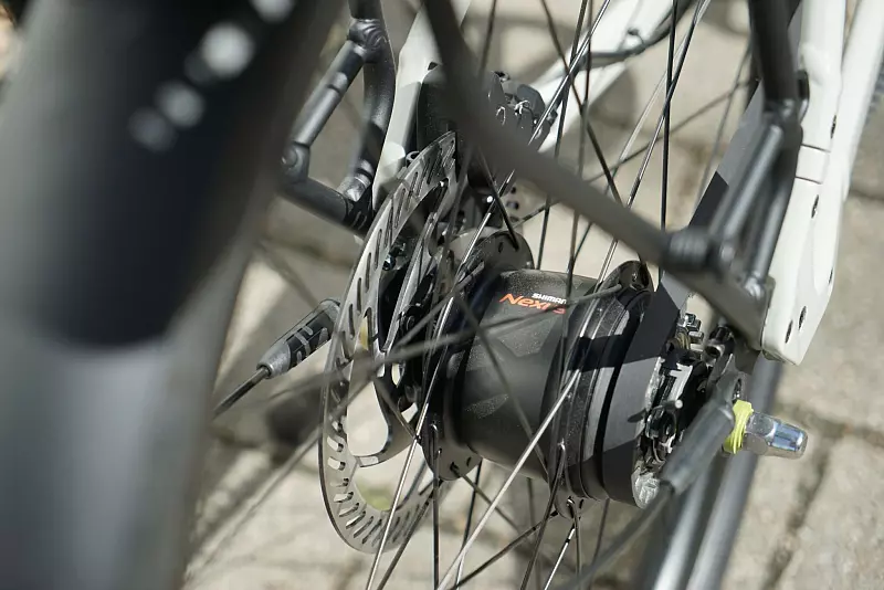 Bewährte Schalttechnik: In der Hinterradnabe ist die Achtgang-Nexus von Shimano untergebracht. (© Stefan Weißenborn/dpa-tmn) Auf jegliche Federungselemente wie Federgabel, gefederte Sattelstütze oder gar Rahmendämpfer (an Highend-Cityrädern zu finden), verzichtet Canyon. Aber was am Bike verbaut ist, genügt in vielen Situationen im Stadtverkehr auch: Der gepolsterte Sattel liefert im Zusammenspiel mit den 47 Millimeter breiten Reifen einen hinreichenden Fahrkomfort. Doch auf Kopfsteinpflaster, in mancher Altstadt durchaus Teil des Radleralltags, reichen der steife Alu-Rahmen und auch die dank Carbon-Werkstoff etwas flexiblere Gabel die härteren Schläge doch an Handgelenke und Allerwertesten weiter.