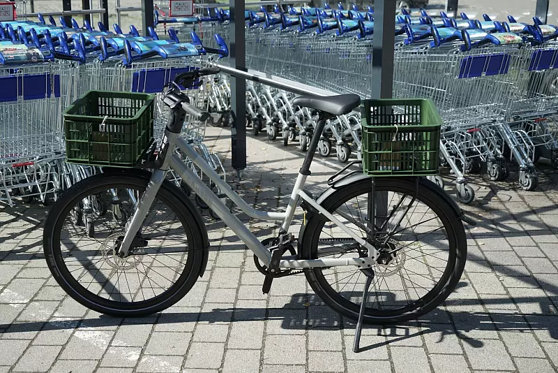 Je 17,5 Liter umfassen die beiden Kisten, nicht so viel wie ein Einkaufswagen, aber gut für einen ordentlichen Supermarkteinkauf. (© Stefan Weißenborn/dpa-tmn) Wie es sich für ein Alltagsrad gehört, sind Schutzbleche, Ständer und Rahmenschloss vorhanden. Wichtig für Eltern und weiteren Transportbedarf: Auch für Fahrradanhänger ist das Citylite freigegeben.