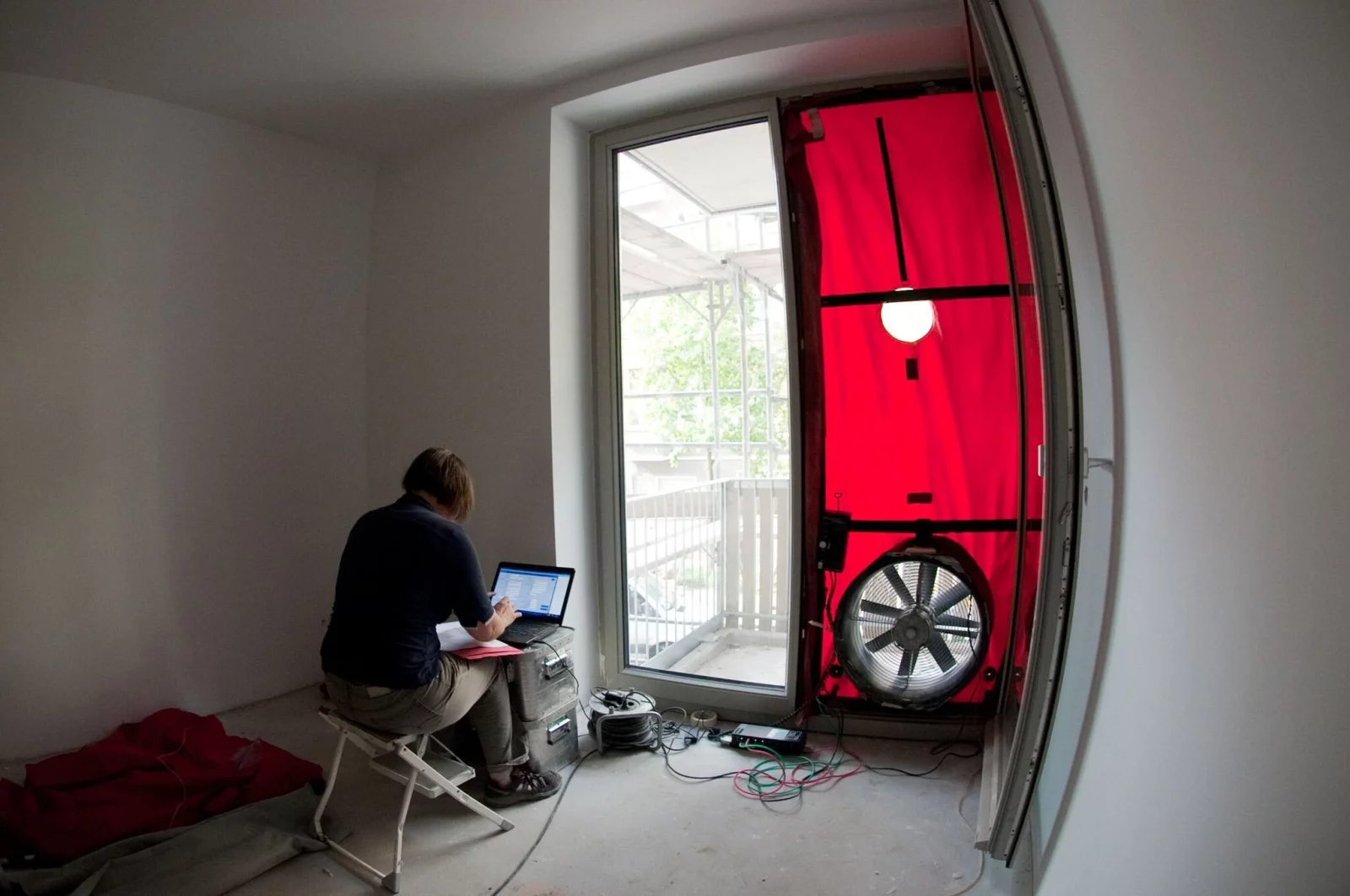 Grob gesagt wird dabei ein Ventilator mit kalibrierter Messblende eingesetzt. Das Gerät wird mit einer luftundurchlässigen Plane umgeben und in eine Tür- oder Fensteröffnung eingesetzt. Dann wird für den geförderten Volumenstrom Luft in das zu untersuchende Gebäude gedrückt oder herausgesaugt. So können selbst kleinste Löcher aufgespürt werden.