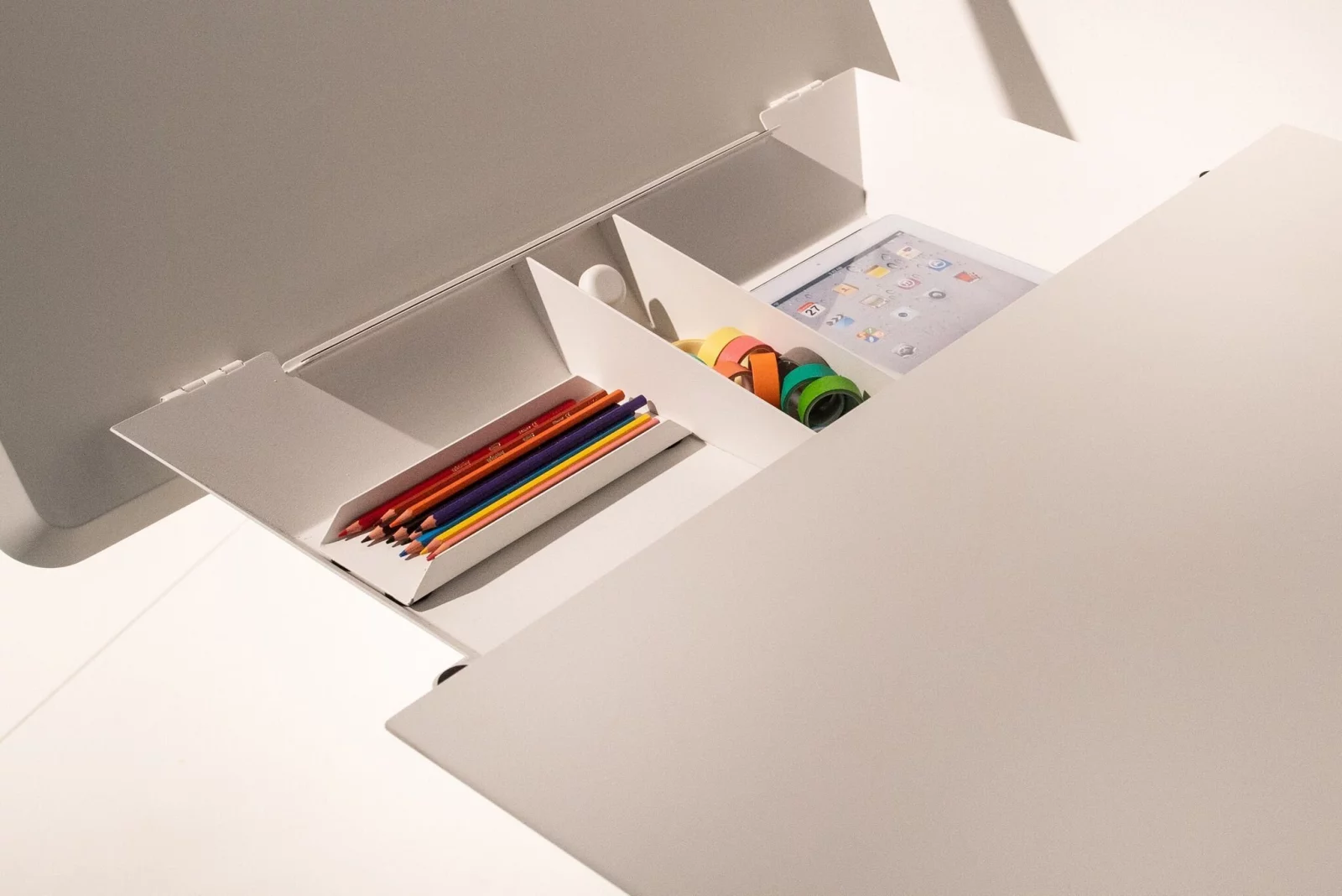 - Oder man schafft Stauraum etwa unter einer Schreibtischplatte, die man hochklappen kann.