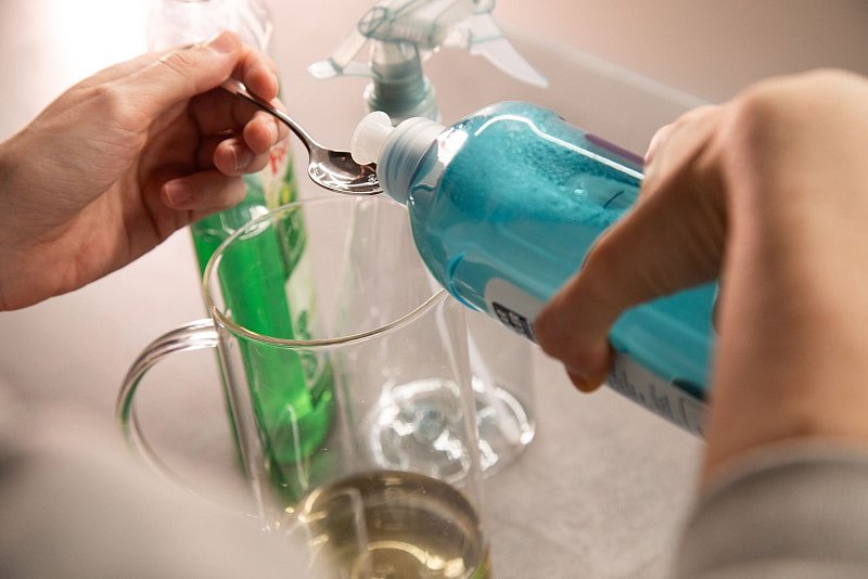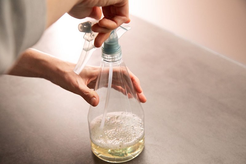 Für das Spray braucht man Wasser, Essig, Spülmittel, Klarspüler und eine Sprühflasche. - © Christin Klose/dpa-tmn