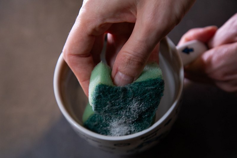 Und so geht's: Etwas Salz auf den Schwamm streuen und damit kräftig die Innenseite der Tasse schrubben. Die Tasse anschließend mit klarem Wasser ausspülen. Bei hartnäckigen Rändern kann man den Vorgang wiederholen.
