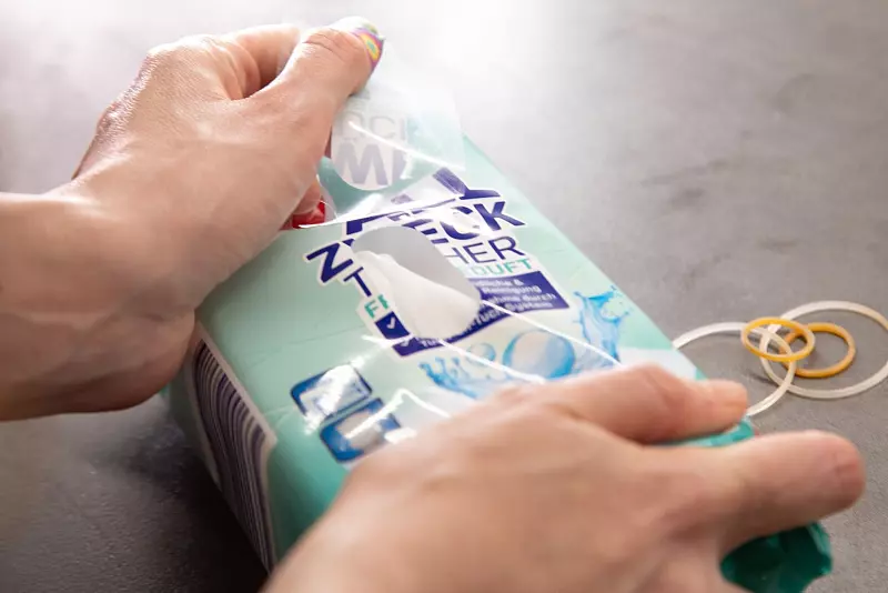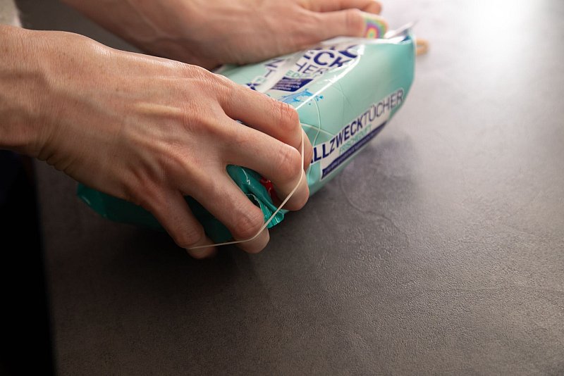 Und so geht's: Gummibänder links und rechts von der Öffnung um die Feuchttücher-Verpackung spannen.