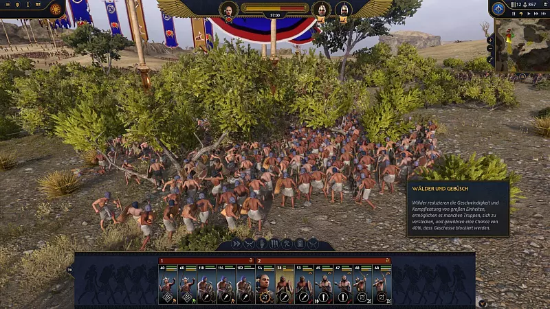 Es ist allerdings eine Epoche, die sich darüber hinaus nur bedingt für ein „Total War“ eignet. Vor allem wenn es zu den Schlachten kommt, werden die Nachteile der Bronzezeit deutlich. Keine Kavallerie, keine Artillerie, keine fliegenden oder magiebegabten Einheiten, wie in den Warhammer-Ablegern der Serie – die Liste jener Einheiten, die bei „Pharaoh“ zu Felde ziehen, ist sehr kurz und beschränkt sich größtenteils auf Infanterie. Das macht die Schlachten ungewöhnlich eintönig.