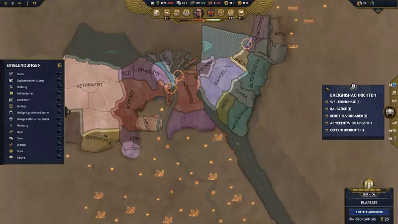 Zugegeben: Die Aufgaben auf der Ebene der Charakter- oder Reichsverwaltung hätten das Potenzial, diese Lücke zu füllen. Einige der neuen Funktionen erscheinen uns aber nicht zu Ende gedacht. Der Hof etwa ist zwar eine nette Angelegenheit. Die damit verbundenen Intrigen scheinen uns aber im Endeffekt nutzlos, weil es letztlich andere Wege zur Spitze des Reiches gibt. Oder die Bürgerkriege: Selbst wenn wir uns als stärkere Fraktion durchsetzen und Pharaoh werden, sind wir nicht automatisch Alleinherrscher über Ägypten. Ein schaler Sieg.
