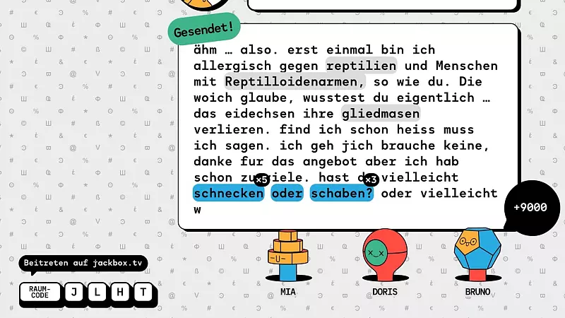 Aber kommen wir zurück zum aktuellen Party-Paket. "FixyText" entfacht das pure Chaos, und es macht so viel Spaß! Die Spieler werden gebeten, auf eine vom Spiel vorgegebene Textnachricht zu antworten. Das Problem dabei: Alle schreiben ins selbe Textfeld, aber an einer jeweils unterschiedlichen Stelle, die man sich vorher aussucht. Das weitere Problem: Es gibt nicht nur ein Zeitlimit und ein Zeichenlimit – es gibt auch keine Rücktaste. Wir können Schreibfehler also nicht löschen. Und: nein, Journalisten und Lehrerkinder haben in diesem Spiel keine Vorteile. Haben wir ausprobiert. Unter Stress und Textbefeuerung von allen Seiten vergisst man seine Rechtschreibschule.