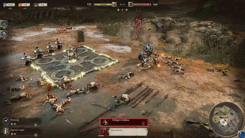 Zunächst ist da die Spielgrafik. Wir haben uns öfter die Einheiten oder Kämpfe aus der Nähe angeschaut, weil das Game gut ausschaut und wuchtig inszeniert ist. Wirklich gut hat uns zudem das verschlankte Gameplay gefallen. Anders als bei anderen Vertretern des Genres ist der Basenbau bei „Age of Sigmar: Realms of Ruin“ im Prinzip komplett eingedampft. Es gibt ein Gebäude, das bereits zu Beginn eines Spiels steht. Was wir in „Warcraft III“, „Age of Empires“ oder den „Command & Conquer“-Teilen jeweils mit einer Handvoll von Gebäuden regeln, läuft hier über einen zentralen Bau.
