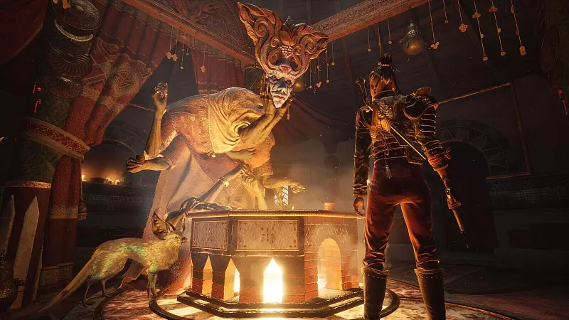 Und: Wir dürfen den Schwierigkeitsgrad – anders als in „Dark Souls“ – auch jederzeit runterdrehen. Dann lässt sich „Flintlock“ wie ein Action-Adventure spielen. Und das macht auch abseits der Kämpfe durchaus Laune. Denn wir dürfen die handgebauten Areale ziemlich frei erkunden, so ziemlich alles, was erreichbar aussieht, ist es auch – und hält nicht selten Fundstücke bereit. Da zieht zum Beispiel „God of War“ deutlich engere Levelgrenzen. Außerdem können wir mithilfe unseres göttlichen Sidekicks Abkürzungen durch die Level nutzen, mit denen auch „Corpse Runs“ (Rückkehr zur eigenen Leiche nach dem Ableben, um Erfahrungspunkte zurückzubekommen) zumindest etwas kürzer ausfallen.