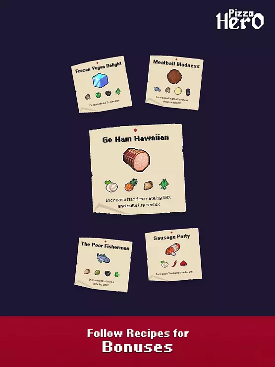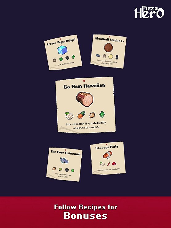 Freischalten lassen sich nicht nur Upgrades, sondern vor allem auch Rezepte. Folgt man im Spiel etwa einem der fünf verschiedenen Rezepte und kombiniert die richtigen Toppings, erhält die Pizza Boni. Bekommt man also etwa eine Pizza Hawaii zustande, wird mehr Schinken schneller abgefeuert.