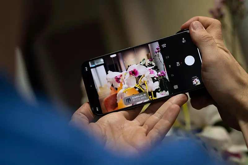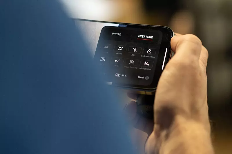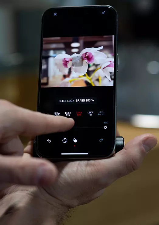Einmal gekoppelt, erweitert der Griff die App tatsächlich sinnvoll. Mit dem Scrollrad blättert man schnell durch verschiedene Fotostile oder simulierte Filme, wechselt vom Summilux- auf das Noctilux-Objektiv oder schraubt schnell die Blende zu. Das Handling fühlt sich mehr nach Kamera an, als der übliche Tipp- und Wischbetrieb einer Smartphonekamera. Die beiden Funktionstasten lassen sich mit den Lieblingseinstellungen belegen. Im Test haben wir mit der einen Taste die Objektive durchgeschaltet, die andere Taste wechselte zwischen Foto- und Aperture-Modus.