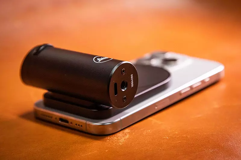 Der Griff wird magnetisch am iPhone (ab iPhone 12) befestigt und hält sicher im Hoch- und Querformat. Achtung, das neue iPhone 16e verfügt nicht über MagSafe und ist damit nicht geeignet. Mit einem Torx-Schraubendreher lässt sich der Lux-Grip auf Linkshänderbetrieb umrüsten. Der integrierte Akku hält laut Leica 1.000 Aufnahmen durch, Aufladen dauert zwei Stunden.