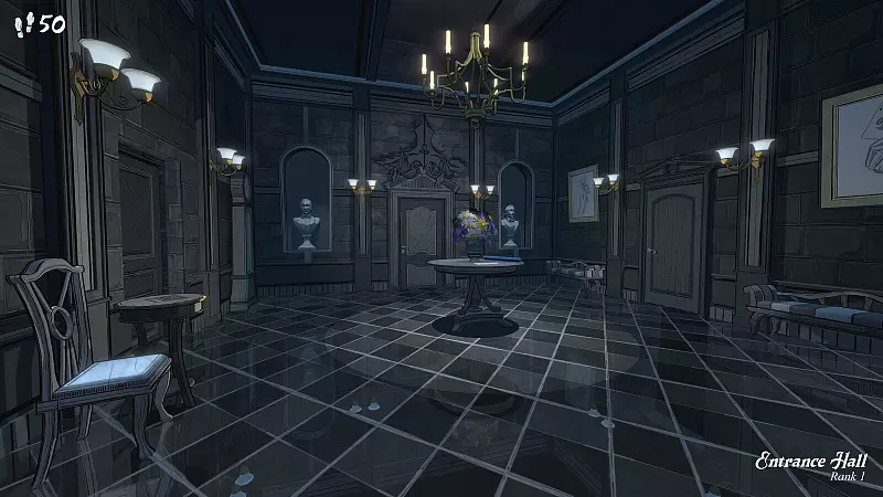 Wir haben auch nur 50 Schritte zur Verfügung. Zwar kann man die Räume beliebig lange durchsuchen. Doch sobald wir eine Tür durchqueren, verlieren wir einen Schritt. Zusätzlich müssen wir im Auge behalten, wie viele Schlüssel und Juwelen wir haben. Denn je weiter wir in der Villa kommen, desto wahrscheinlicher ist es, dass sich Türen nur mit Schlüsseln öffnen lassen. Und die besten Räume kosten uns Juwelen.