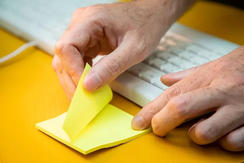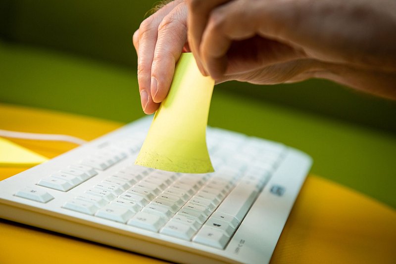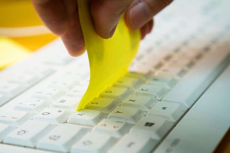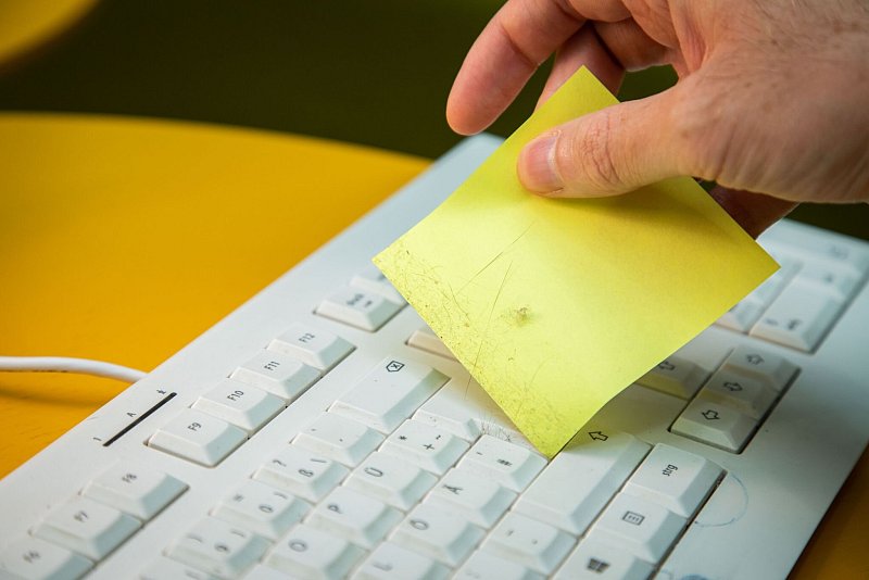 Und so geht's: Den Klebezettel mit dem Haftstreifen nach unten in die Zwischenräume der Tastatur schieben und zwischen den Tastenreihen entlangfahren. Den Klebezettel anschließend umdrehen und den Vorgang wiederholen.