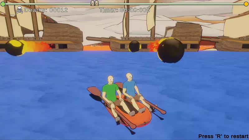 Bei der gemeinsamen Paddeltour geht es durch einen charmant-lieblos gestalteten Hindernisparcours. Rotierende Stacheln am Rande des Wassers, sich drehende Stachel-Windrädern in der Mitte, Lavagruben, große Steine und aus dem Boden ploppende Stacheln können das Boot mit nur einer Berührung zum Kentern bringen. Das Boot bewegt sich dabei wie Super Mario in einem Eislevel: Es schlittert ein wenig und bevor man volle Geschwindigkeit erreicht, muss man erst einmal ordentlich lospaddeln.
