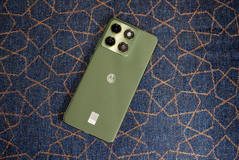 «Bronze Green» heißt die Farbe des Testgeräts: Ein Olivton, den Motorola mit einem leuchtenden, grünlichen Goldton für Kameraringe und Knöpfe kombiniert. (© Nico Tapia/dpa-tmn)