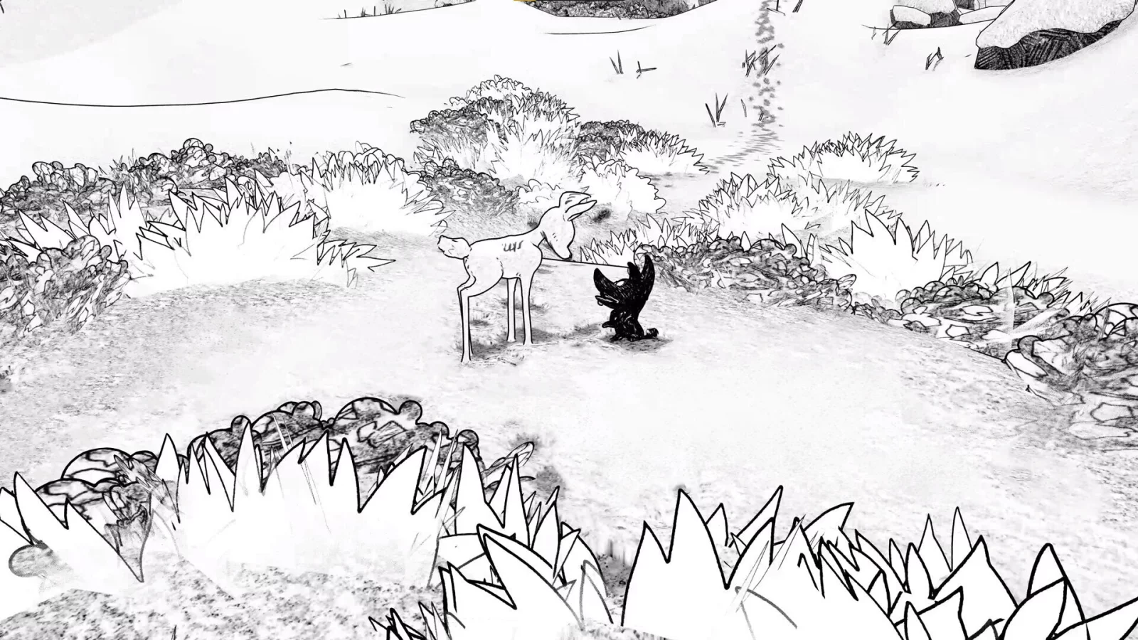 Als „Blanc“ im Februar 2023 erschien, war es ein Experiment: ein komplett wortloses Koop-Abenteuer über ein Rehkitz und ein Wolfsjunges, die gemeinsam durch eine monochrome Schneelandschaft finden müssen.