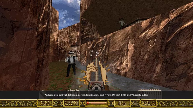 Spielerisch fühlt sich „Outlaws + Handful of Missions: Remaster” nach wie vor wie ein schneller Shooter der späten 90er an. Das Remaster konzentriert sich darauf, die bekannte Story und ikonische Western-Folklore zu bewahren, ohne sie modern umzuschreiben. Gegner verhalten sich simpel, aber entschlossen. Leider nerven ihre markigen Sprüche auf Dauer ein wenig, da sie sich zu oft wiederholen.
