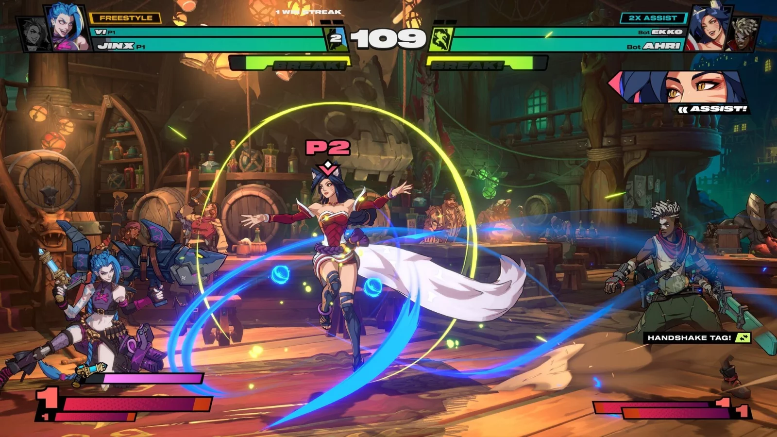 Nur treten in «2XKO» in der Regel pro Seite zwei Kämpferinnen oder Kämpfer an, die übrigens alles Figuren aus der Welt von «League of Legends» sind. Spielende können während der Runde zu jeder Zeit die Kämpfenden auswechseln, was sie taktisch zu ihrem Vorteil nutzen können.