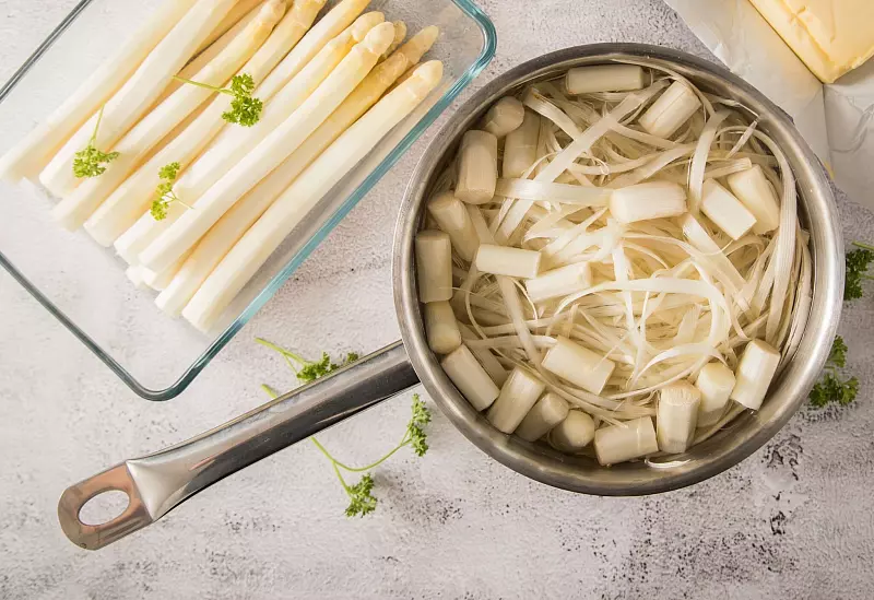 Die Spargelenden und die Schalen müssen übrigens nicht im Müll landen, sie eignen sich laut Thomas Dippel gut für einen Spargelfond: «Aus diesem macht man klassischerweise Spargelsuppe. Er ist aber auch gut für ein Spargelrisotto als Basis geeignet.»