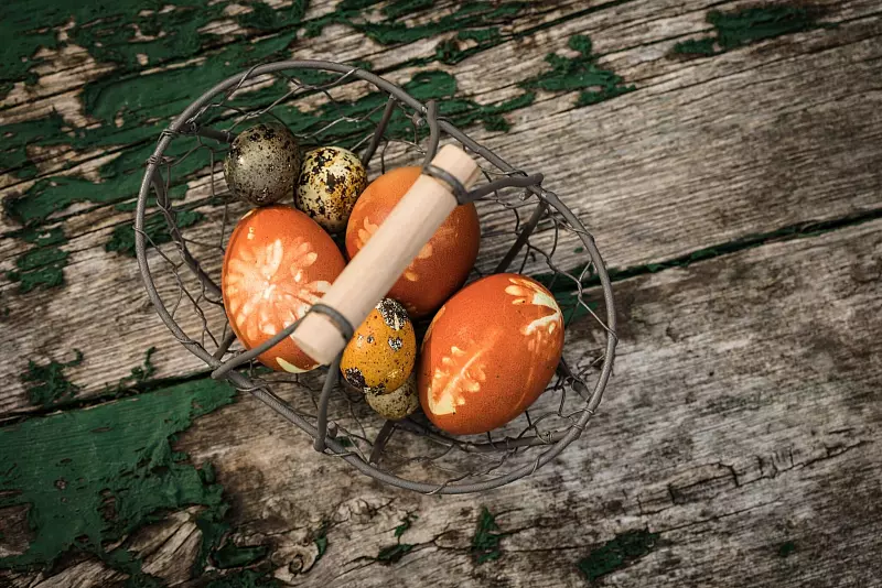 Wer einen besonderen Effekt erzielen möchte, kann mit Blättern oder Blumen Muster auf den Eiern erzeugen. Dazu einfach ein kleines Blatt auf das Ei legen, es in einen alten Nylonstrumpf einwickeln und im Farbsud ziehen lassen.