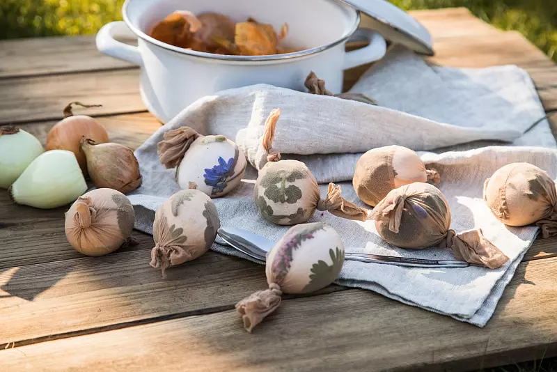 - Gelb: Birkenblätter, Zwiebelschalen, Kurkuma oder Johanniskraut