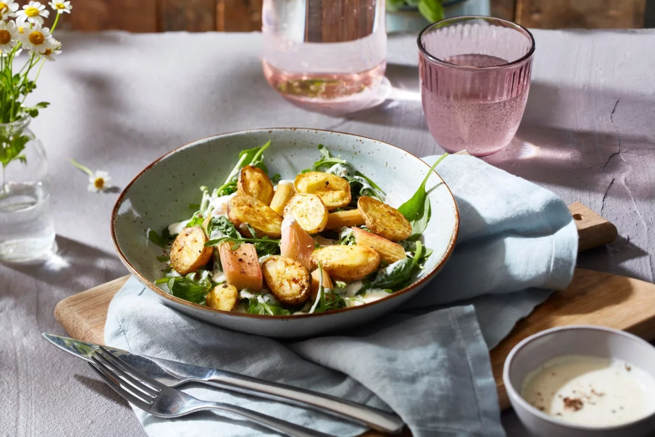 - Kartoffeln aus dem Ofen holen und ebenso wie den Rhabarber etwas abkühlen lassen. Anschließend auf dem Blätterbett anrichten. Das Ganze mit dem cremigen Orangen-Dressing beträufeln und sofort servieren.
