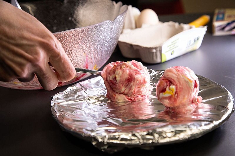 - Nach wenigen Minuten Einwirkzeit die Eier mit einem Löffel vorsichtig herausnehmen und auf ein Stück Alufolie legen.