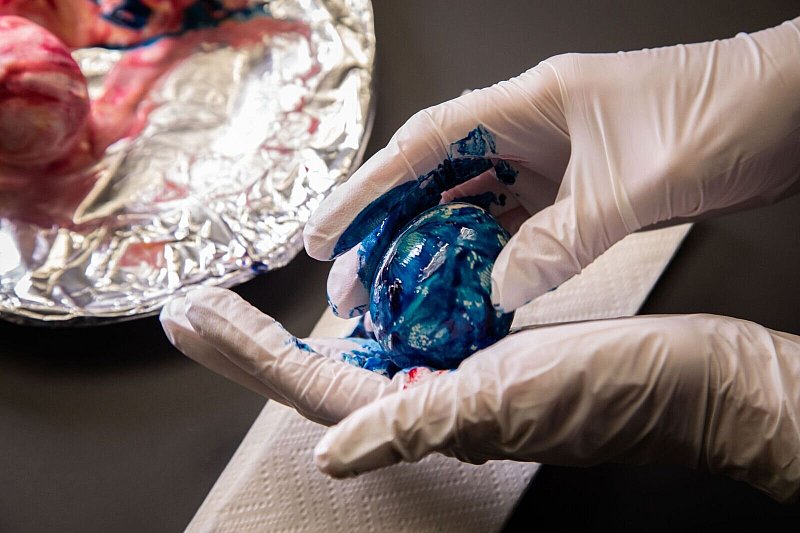 Wir haben außerdem getestet, ob man die Lebensmittelfarbe auch einfach direkt auf die Eierschale geben kann. Die Vorgehensweise bleibt dieselbe: Farbe auf das Ei geben und einwirken lassen. Dabei bitte unbedingt Handschuhe anziehen.
