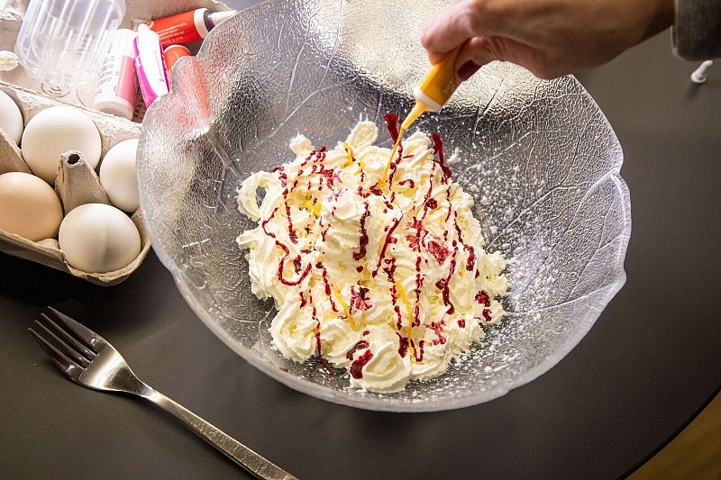 - Lebensmittelfarbe darauf verteilen und mit einer Gabel durchmischen.