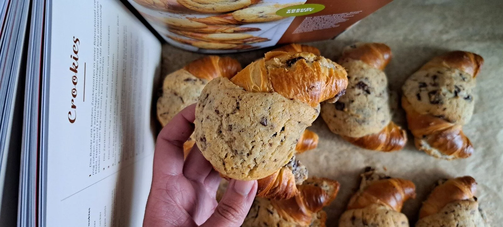Tatsächlich hat keines der auf den 160 Seiten aufgeführten Rezepte mehr als acht Arbeitsschritte und der Blätterteig, der für manche Rezepte gebraucht wird, kann auch fertig gekauft werden, wie für die Croissants, die für die Crookies gebraucht werden. Laut Beschreibung hat man das fertige Gebäck in dem Fall dann sogar schon nach einer knappen Stunde essbereit auf dem Tisch stehen – wobei eine halbe Stunde alleine fürs Abkühlen einberechnet wird –, da man die Croissants nur nach Backanleitung aufbacken sowie einen recht einfachen Schoko-Keksteig zubereiten und in und auf die Croissants geben muss. Unser Test zeigt: Die Zeitangabe passt!
