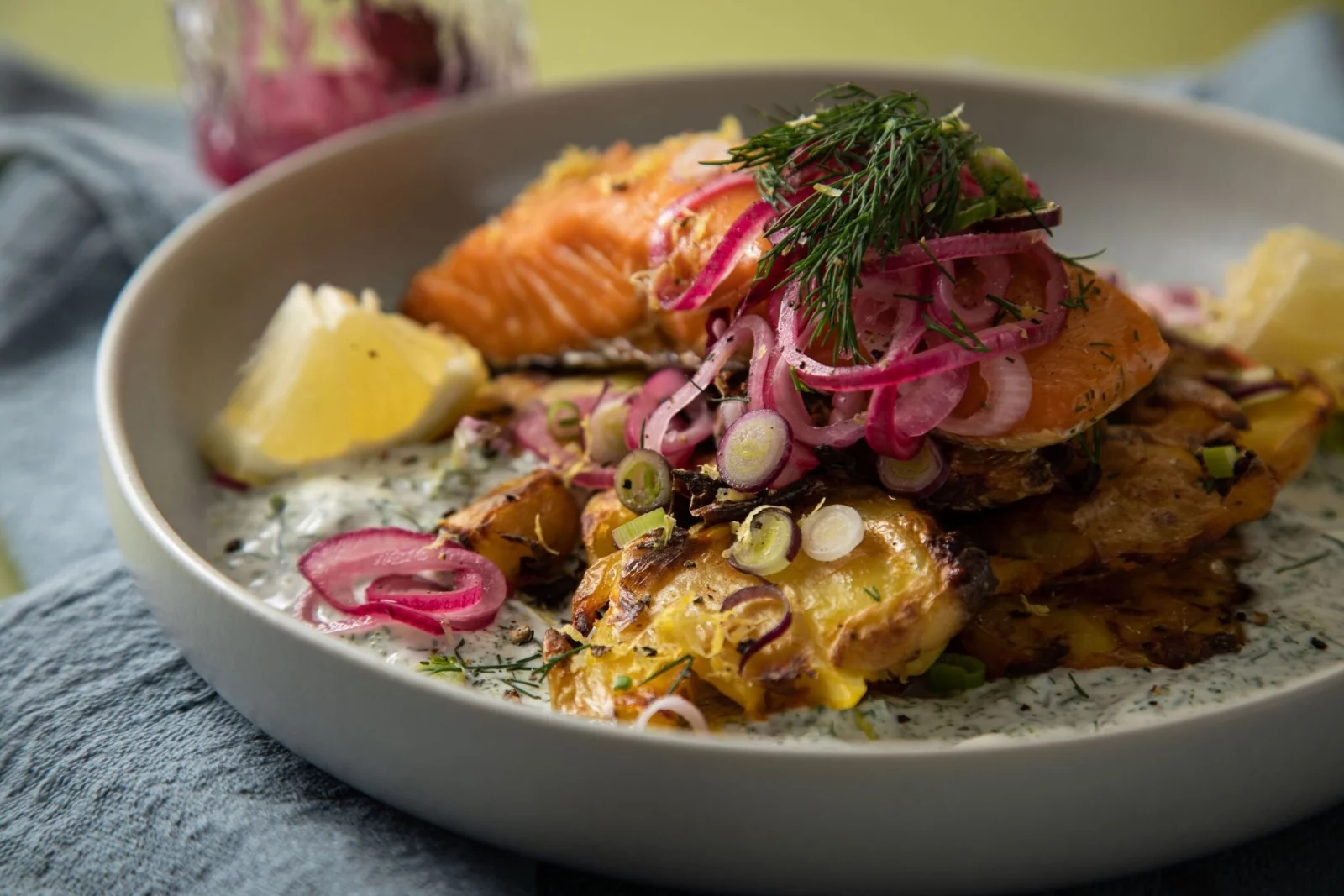 Auf der Suche nach einem schnellen und unkomplizierten Mittsommer-Rezept kam Michaela Fuchs auf eine geniale Idee. Die Münchner Food-Bloggerin und Liebhaberin der nordischen Küche kombinierte trendy Ofen-Quetschkartoffeln mit den Zutaten für einen klassischen schwedischen Kartoffelsalat, auf Schwedisch Potatissallad.