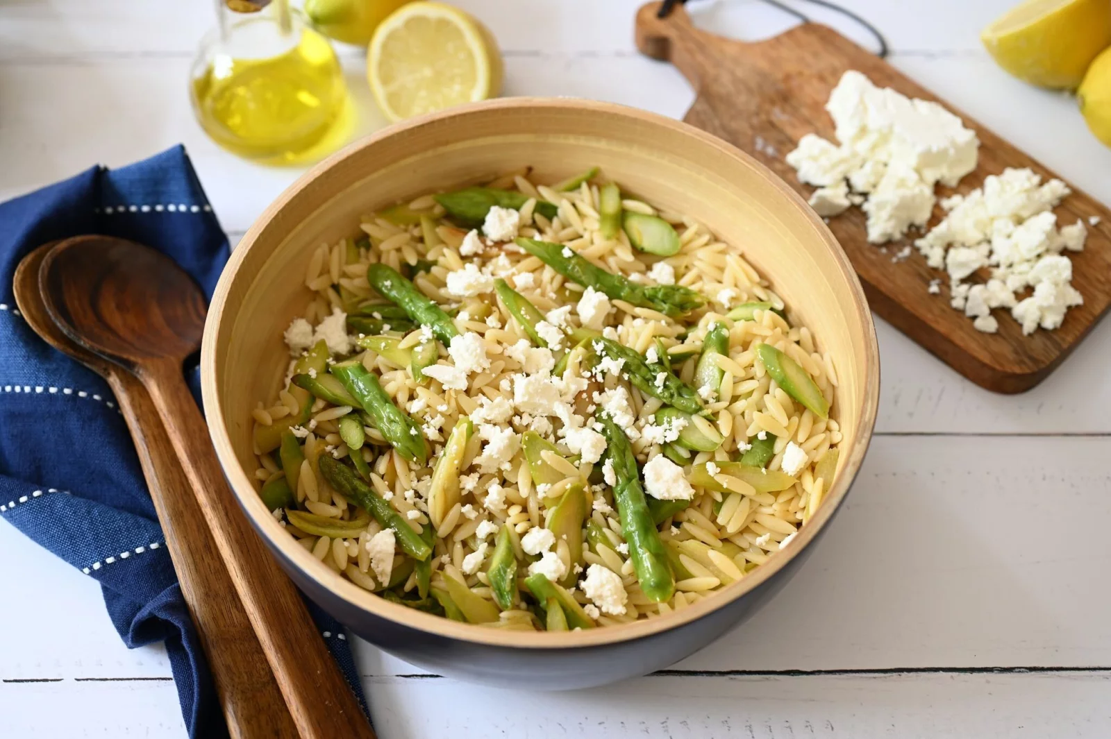 - Kritharaki zusammen mit Spargel und Dressing in eine große Schüssel füllen und gut vermengen. Ca. 15 Minuten ziehen lassen.