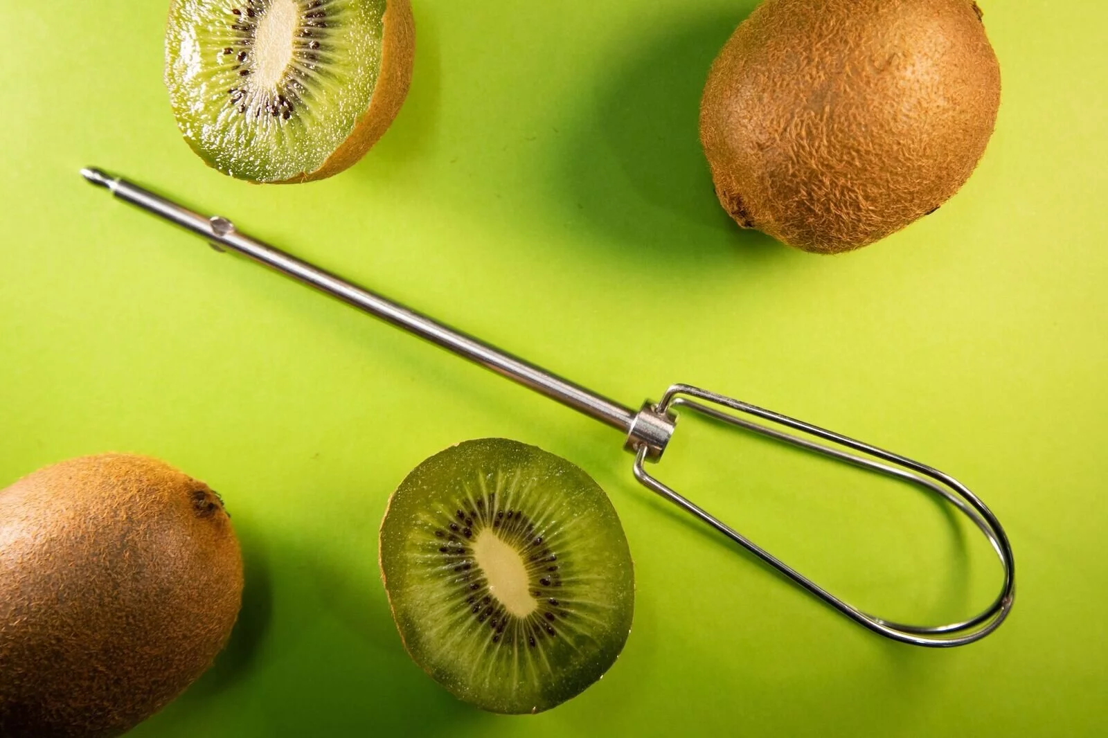 Und so geht's: Die Kiwi in zwei Hälften schneiden. Den Rührbesen-Aufsatz des Handmixers gerade in die Kiwi stecken, drehen und das Fruchtfleisch so herausziehen.