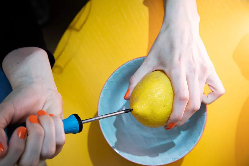 Und so geht's: Mit einem sauberen Schraubendreher in ein Ende der Zitrone stechen und die Frucht damit durchbohren. Die Zitrone mit dem geöffneten Ende nach unten halten und drücken, sodass der Saft austreten kann.