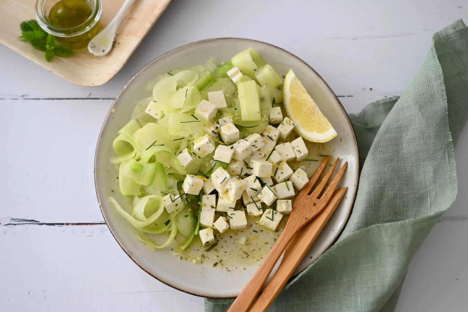 Der Klassiker «Wassermelone mit Feta» bekommt Konkurrenz: In diesem erfrischenden Sommersalat trifft die etwas süßere und festere Honigmelone auf knackige Gurke und marinierten Feta. Dadurch, dass Honigmelone und Gurke in dünne Streifen geschnitten werden, sind Geschmack und Mundgefühl etwas feiner.